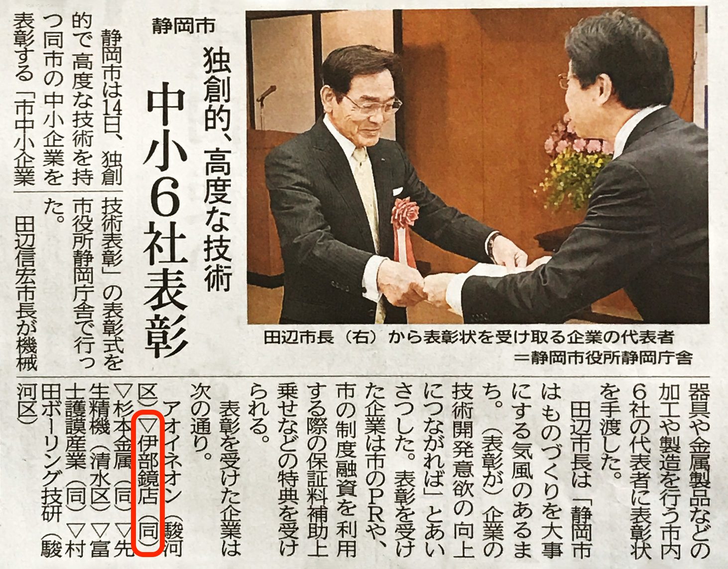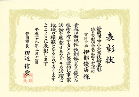 2017年3月 静岡市中小企業技術表彰されました(クリックして拡大)