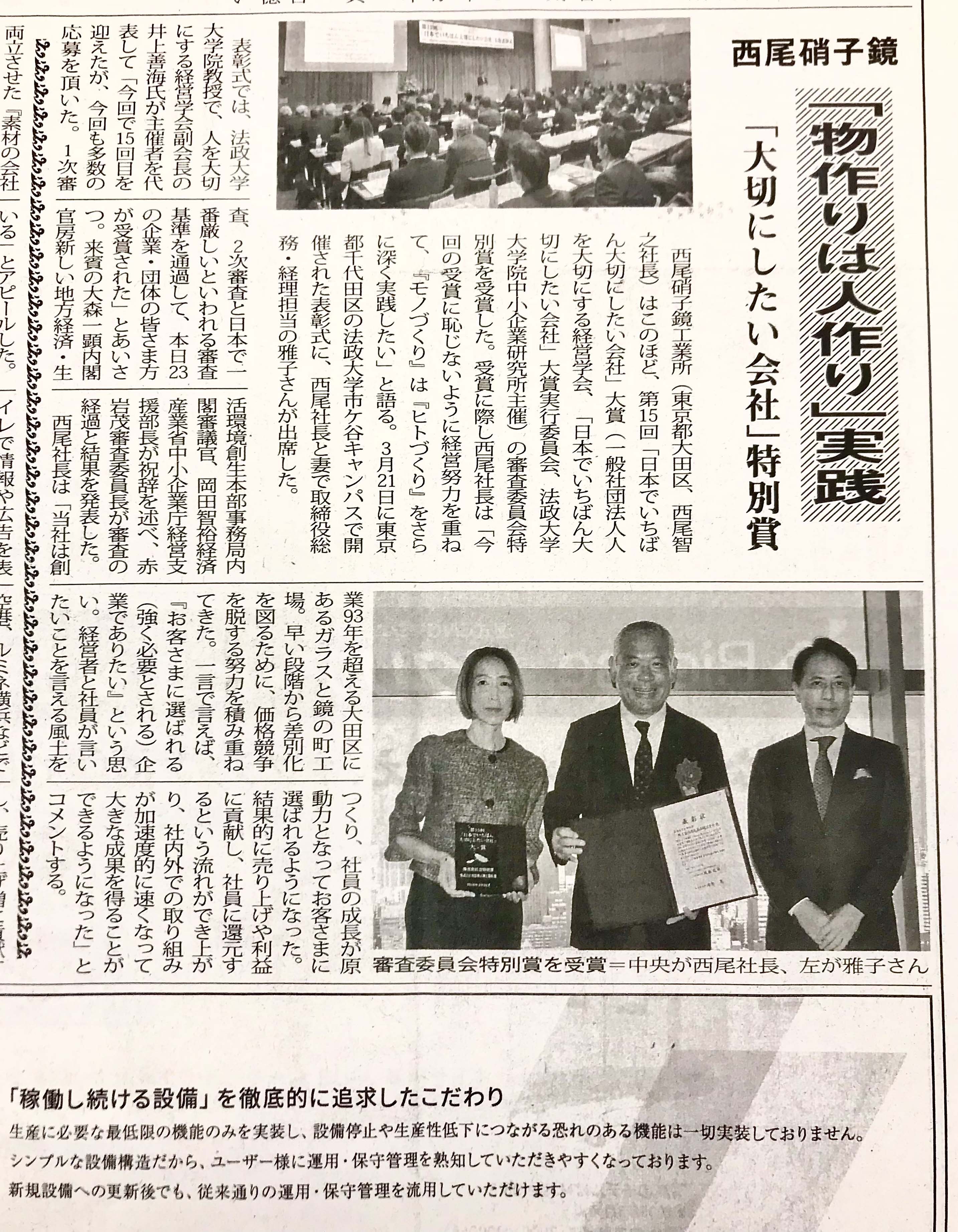2025年6月 同業で活躍しているお会社の(株)西尾硝子鏡工業所さんが日本でいちばん大切にしたい会社大賞を受賞しました。クリックして拡大)